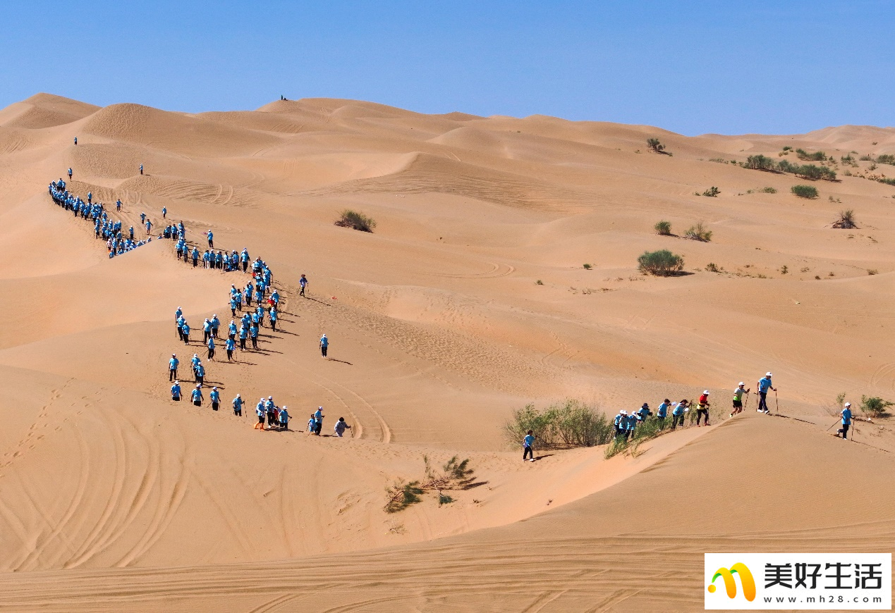 6月25日,运动爱好者在沙漠越野杖走公开赛比赛中(无人机照片)。新华网发(王正 摄)